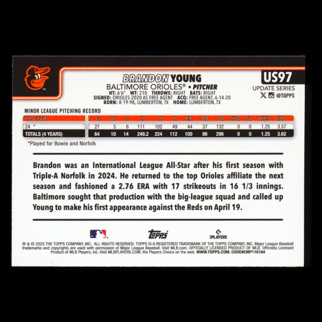 Brandon Young RC 2025 Topps Update Rookie Orioles