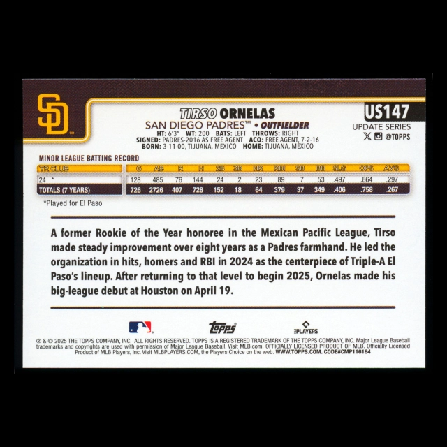 Tirso Ornelas RC 2025 Topps Update Rookie Padres