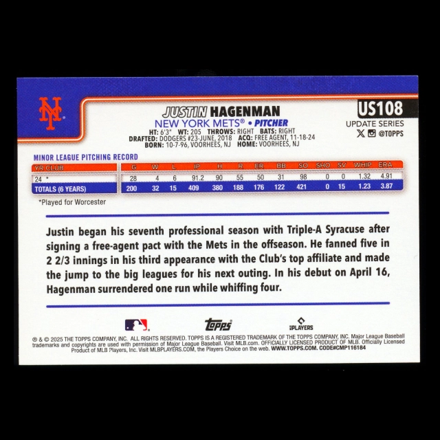 Justin Hagenman RC 2025 Topps Update Rookie Mets