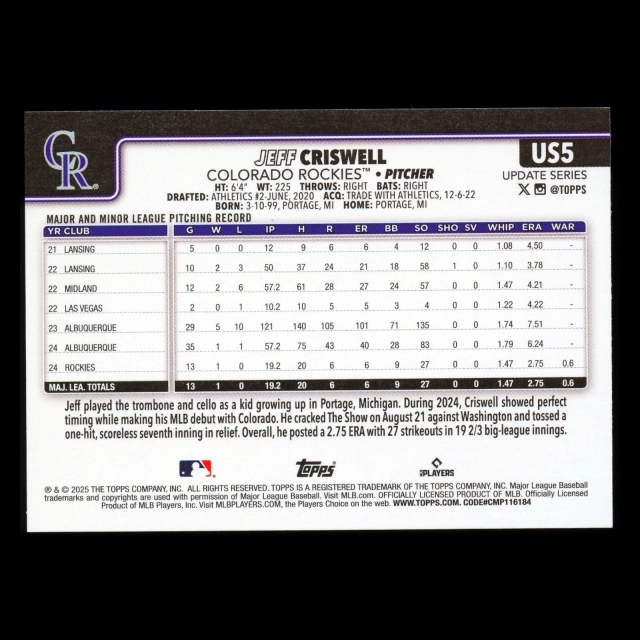 Jeff Criswell RC 2025 Topps Update Rookie Rockies