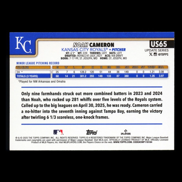 Noah Cameron RC 2025 Topps Update Rookie Royals