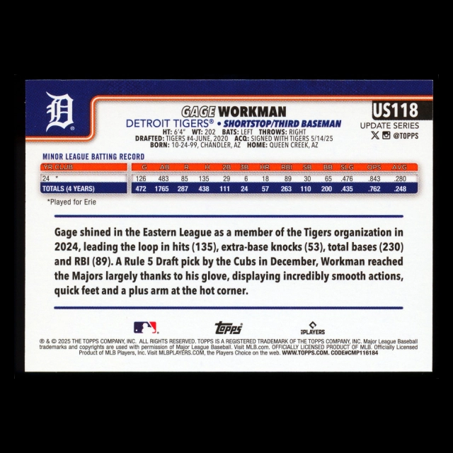 Gage Workman RC 2025 Topps Update Rookie Tigers