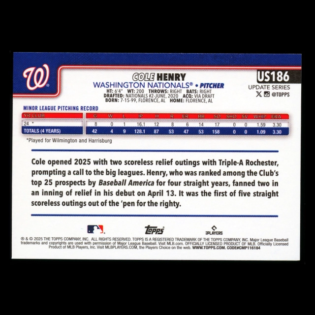 Cole Henry RC 2025 Topps Update Rookie Nationals