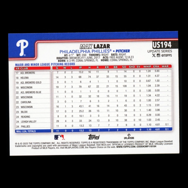 Max Lazar RC 2025 Topps Update Rookie Phillies