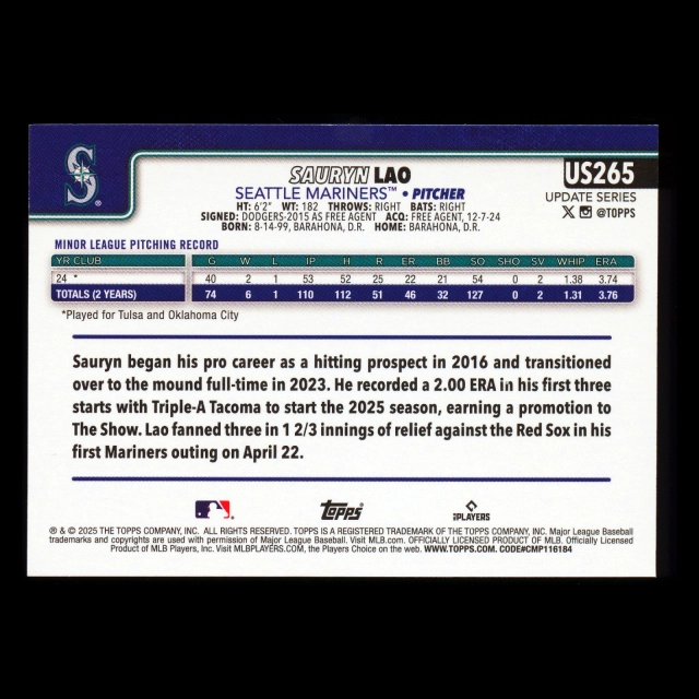 Sauryn Lao RC 2025 Topps Update Rookie Mariners