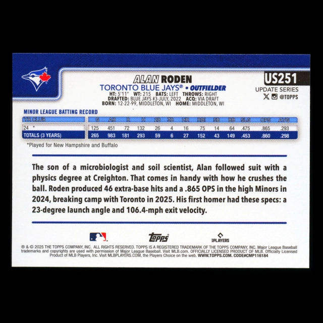 Alan Roden RC 2025 Topps Update Rookie Blue Jays