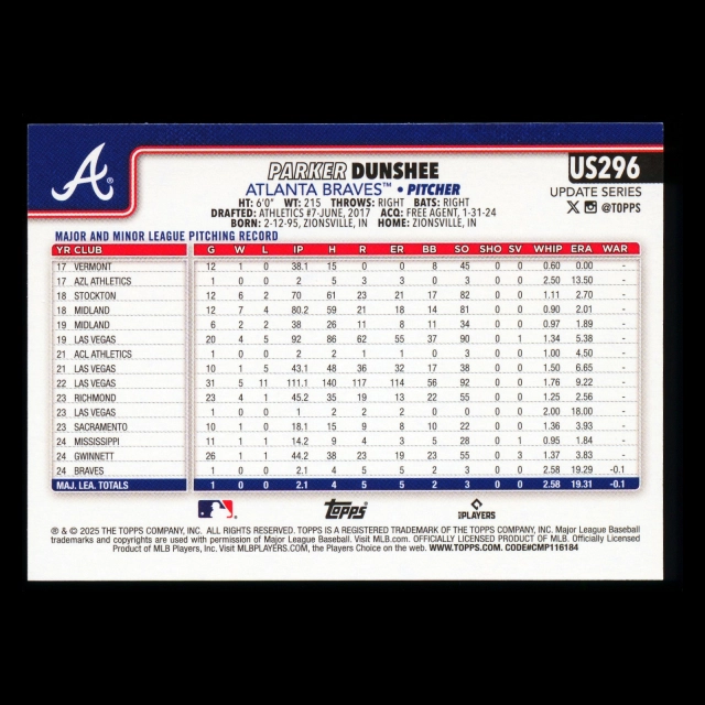 Parker Dunshee RC 2025 Topps Update Rookie Braves