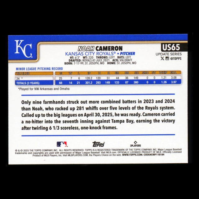 Noah Cameron RC 2025 Topps Update Rookie Royals