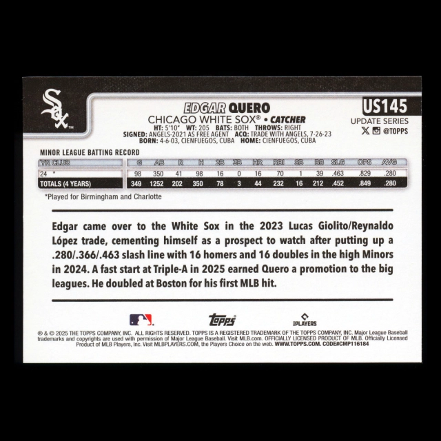 Edgar Quero RC 2025 Topps Update Rookie White Sox