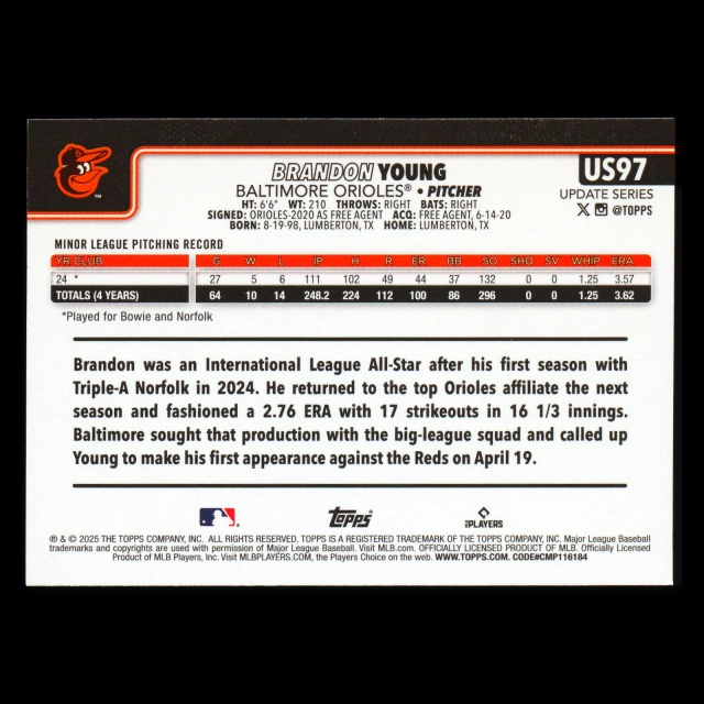 Brandon Young RC 2025 Topps Update Rookie Orioles