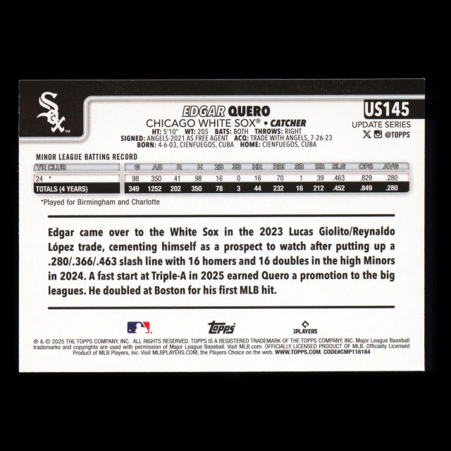 Edgar Quero RC 2025 Topps Update Rookie White Sox