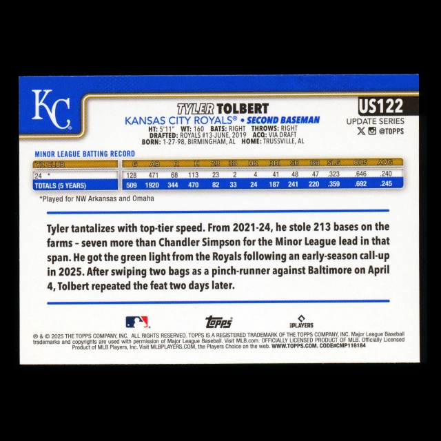Tyler Tolbert RC 2025 Topps Update Rookie Royals