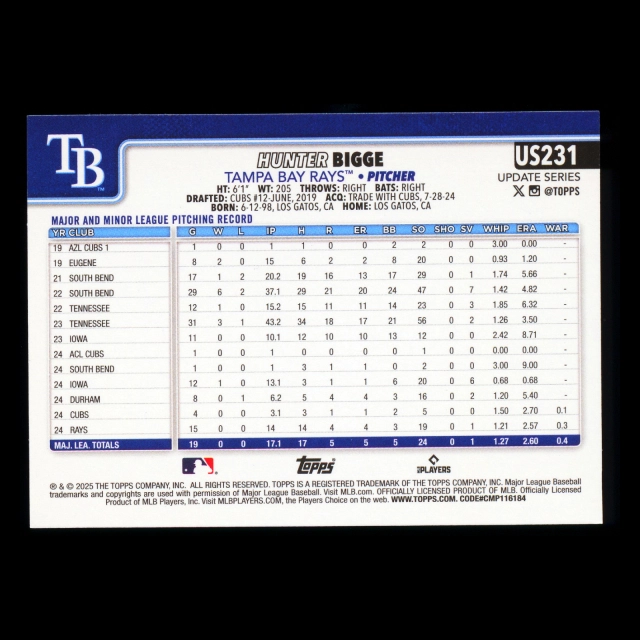 Hunter Bigge RC 2025 Topps Update Rookie Rays