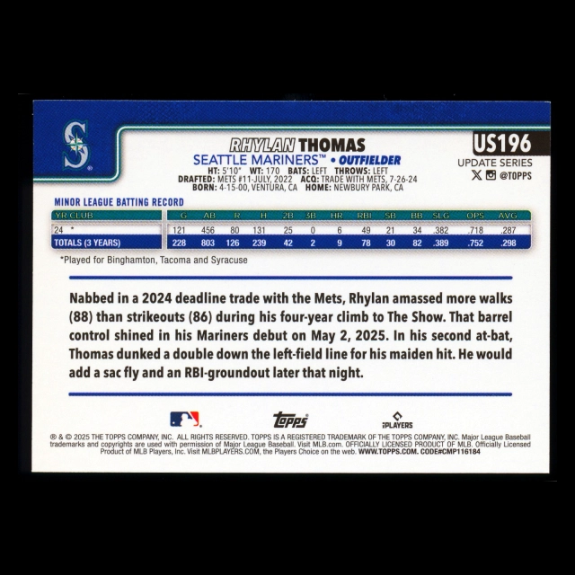 Rhylan Thomas RC 2025 Topps Update Rookie Mariners
