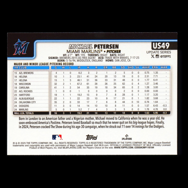 Michael Petersen RC 2025 Topps Update Rookie Marlins