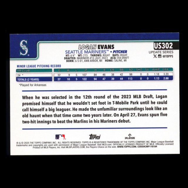 Logan Evans RC 2025 Topps Update Rookie Mariners
