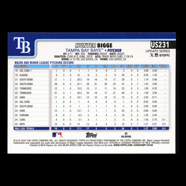 Hunter Bigge RC 2025 Topps Update Rookie Rays