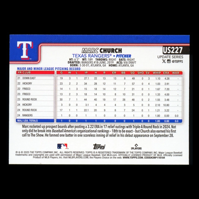 Marc Church RC 2025 Topps Update Rookie Rangers