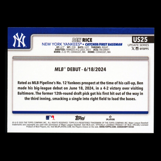 Ben Rice 2025 Topps Update Rookie Debut Yankees