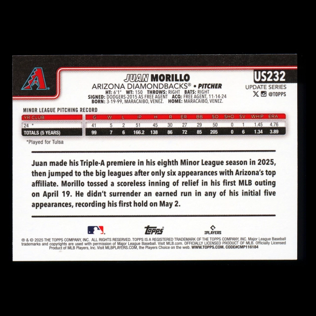 Juan Morillo RC 2025 Topps Update Rookie Diamondbacks