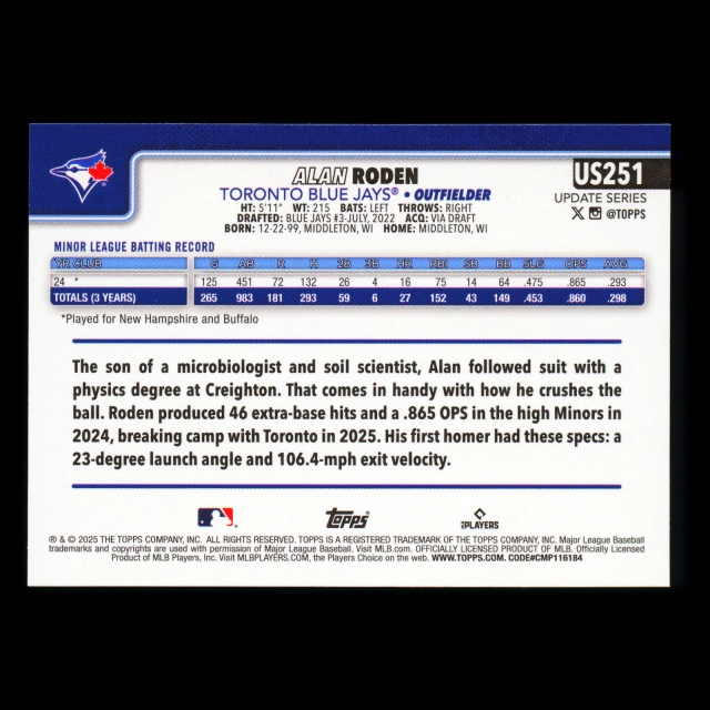 Alan Roden RC 2025 Topps Update Rookie Blue Jays