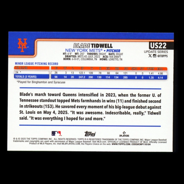 Blade Tidwell RC 2025 Topps Update Rookie Mets