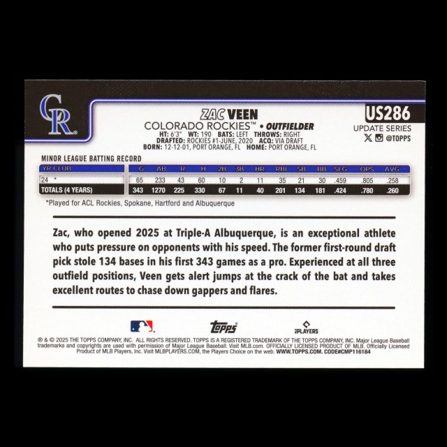 Zac Veen RC 2025 Topps Update Rookie Rockies