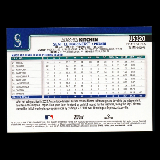 Austin Kitchen RC 2025 Topps Update Rookie Mariners