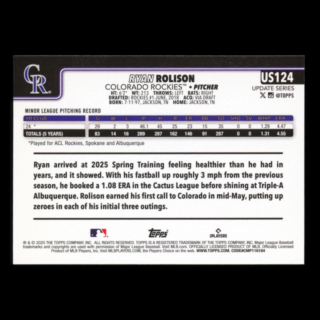 Ryan Rolison RC 2025 Topps Update Rookie Rockies
