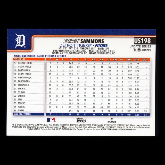 Bryan Sammons RC 2025 Topps Update Rookie Tigers