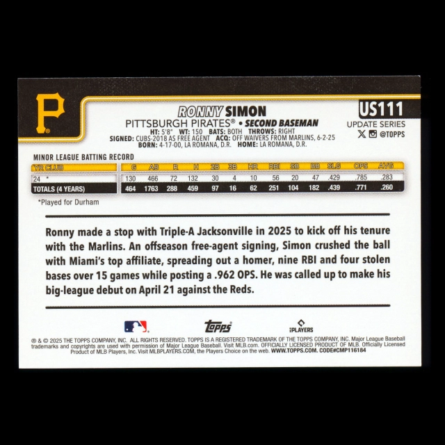 Ronny Simon RC 2025 Topps Update Rookie Pirates