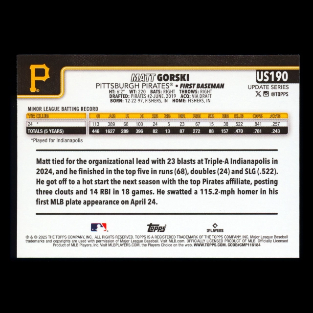 Matt Gorski RC 2025 Topps Update Rookie Pirates