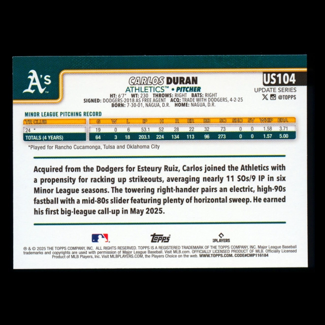 Carlos Duran RC 2025 Topps Update Rookie Athletics