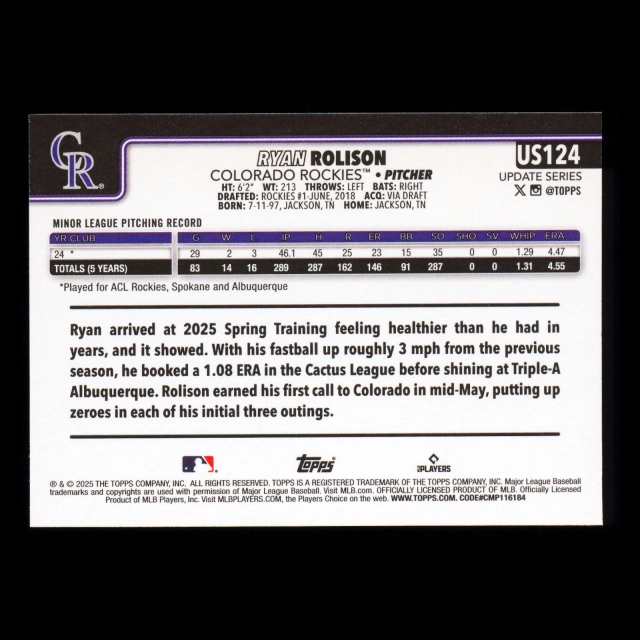 Ryan Rolison RC 2025 Topps Update Rookie Rockies