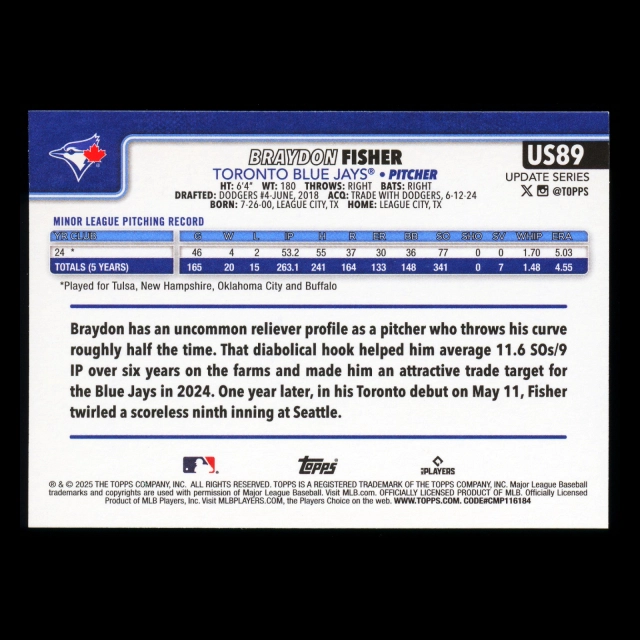 Braydon Fisher RC 2025 Topps Update Rookie Blue Jays