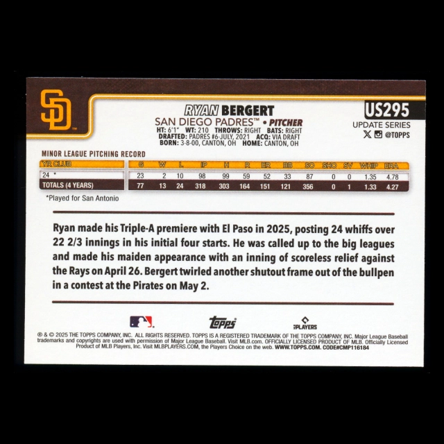 Ryan Bergert RC 2025 Topps Update Rookie Padres