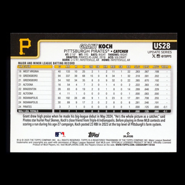 Grant Koch RC 2025 Topps Update Rookie Pirates