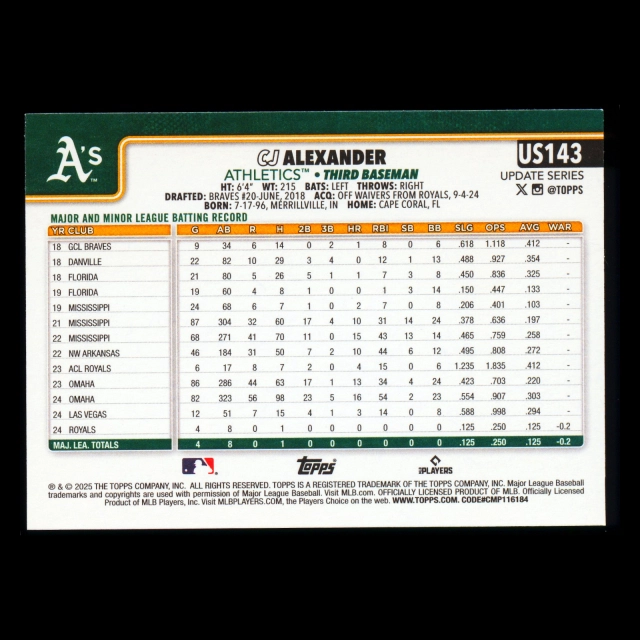 CJ Alexander RC 2025 Topps Update Rookie Athletics