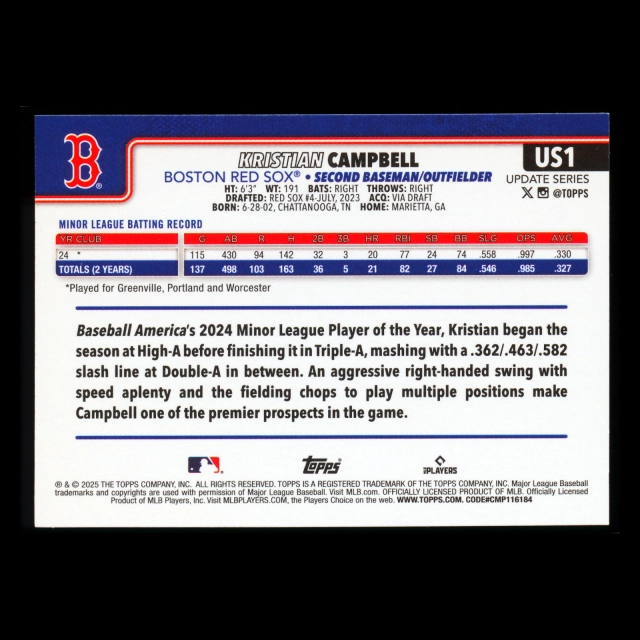 Kristian Campbell RC 2025 Topps Update Rookie Red Sox