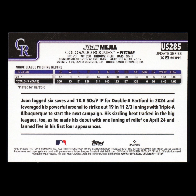 Juan Mejia RC 2025 Topps Update Rookie Rockies