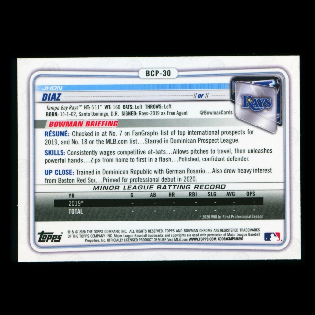 Jhon Diaz 2020 Bowman Chrome 1st Bowman Prospect Rays