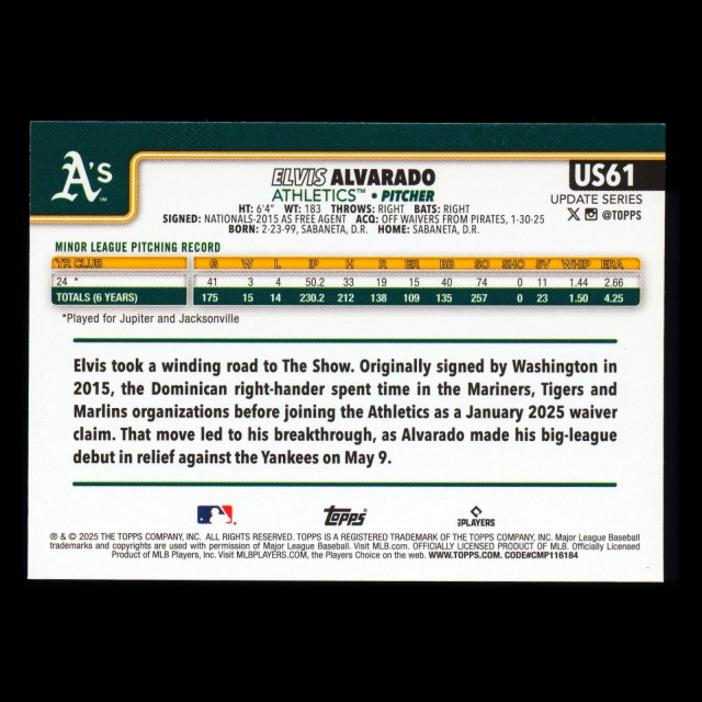 Elvis Alvarado RC 2025 Topps Update Rookie Athletics