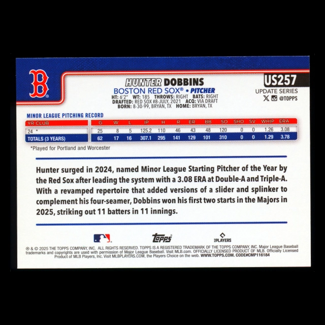 Hunter Dobbins RC 2025 Topps Update Rookie Red Sox