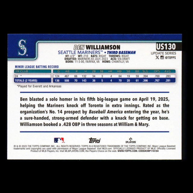 Ben Williamson RC 2025 Topps Update Rookie Mariners