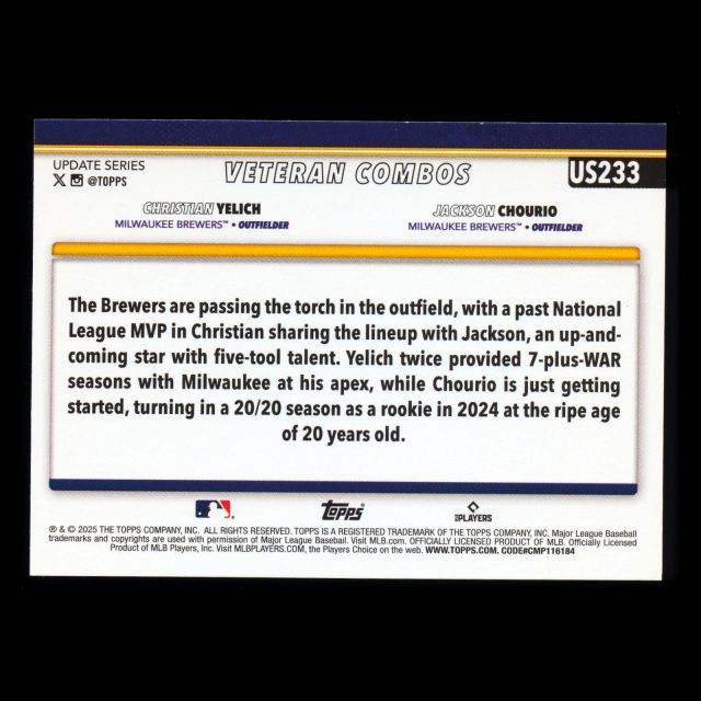 Christian Yelich - Jackson Chourio 2025 Topps Update Veteran Combos Brewers