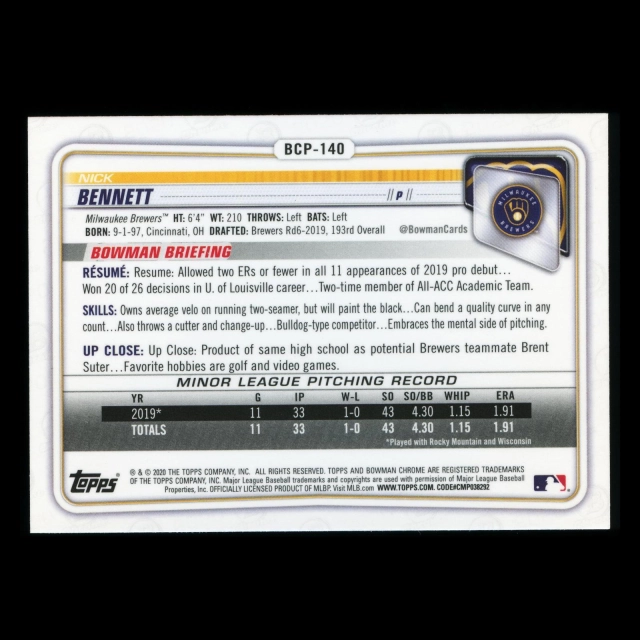 Nick Bennett 2020 Bowman Chrome 1st Bowman Prospect Brewers