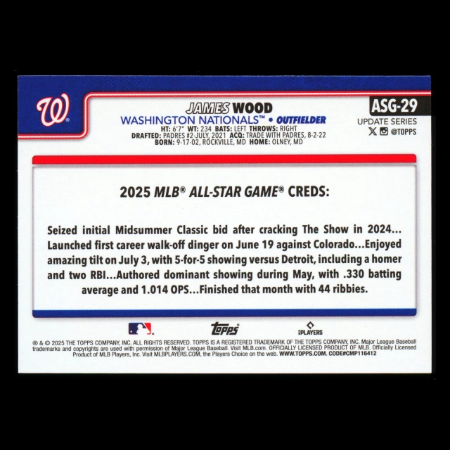 James Wood RC 2025 Topps Update '25 All-Star Game Rookie Nationals