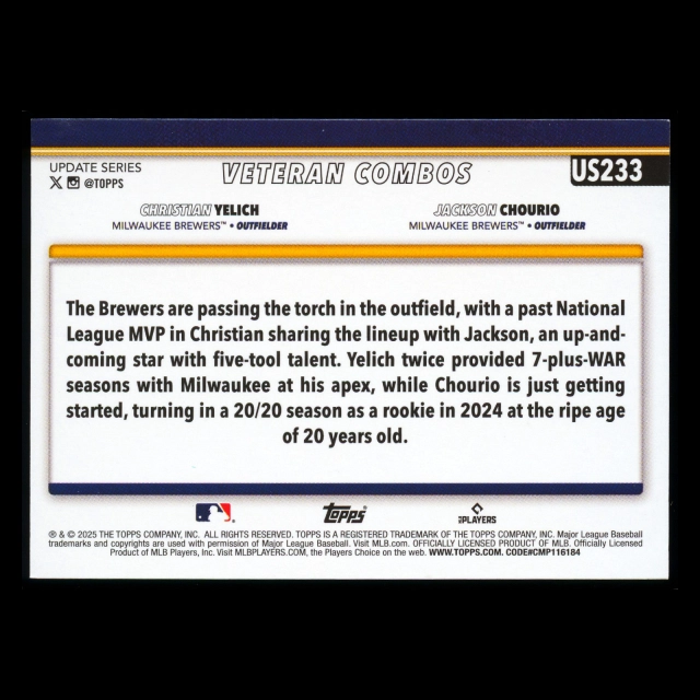 Christian Yelich - Jackson Chourio 2025 Topps Update Veteran Combos Brewers