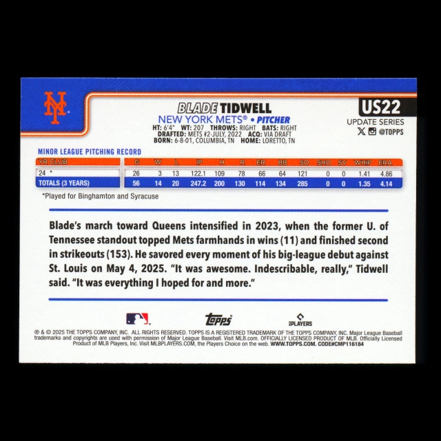 Blade Tidwell RC 2025 Topps Update Rookie Mets