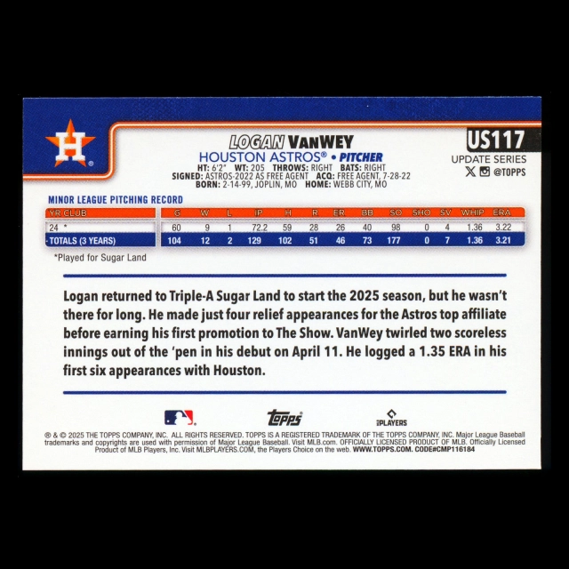 Logan VanWey RC 2025 Topps Update Rookie Astros